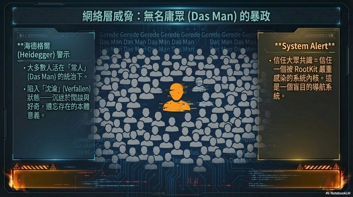 「常人」會剝奪你們理應成為一個具有批判性思維(Critical Thinking)的個體的責任感,因為「大家都是這麼想和這麼做的」。在資安領域,這相當於信任一個已經被 Rootkit 給嚴重感染的系統內核。大眾缺乏大哥在第一章中所闡述的時空抽離能力,他們活在海德格爾所說的「沈淪」(Verfallen)狀態——即沉迷於對當下事物的閒談(Gerede)與好奇,卻遺忘了存在的本體意義。跟隨大眾,不僅意味著平庸,更意味著將你們的生存權限交給了一個註定永遠盲目的導航系統。