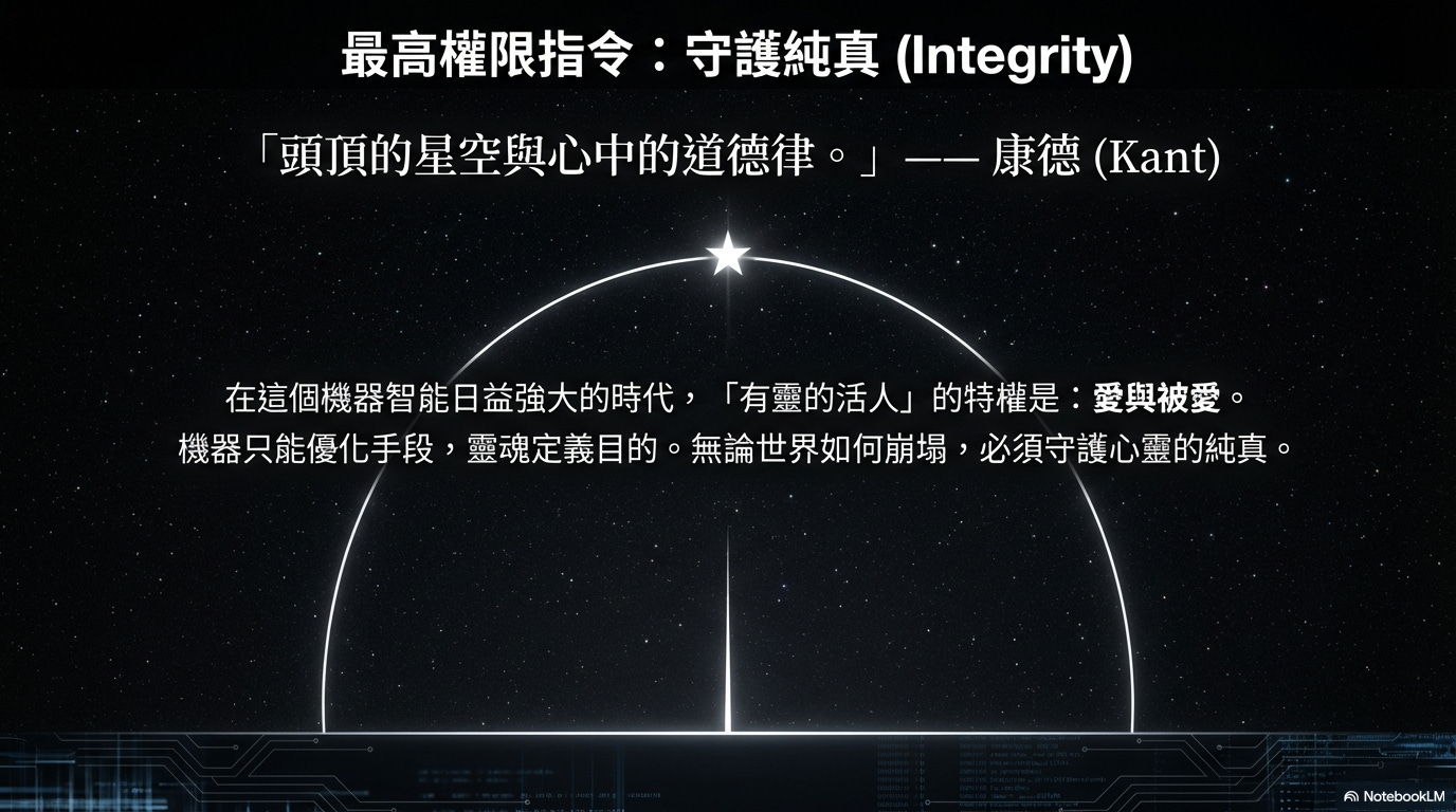 無論外在的世界如何崩塌,無論未來的科技將如何顛覆現今的人類社會結構,你們都必須時刻守護自身心靈的純真(Integrity)。康德(Immanuel Kant)曾說:「有兩樣東西,我越去思考,就越覺得驚嘆與敬畏,那就是頭頂的星空與心中的道德律。」