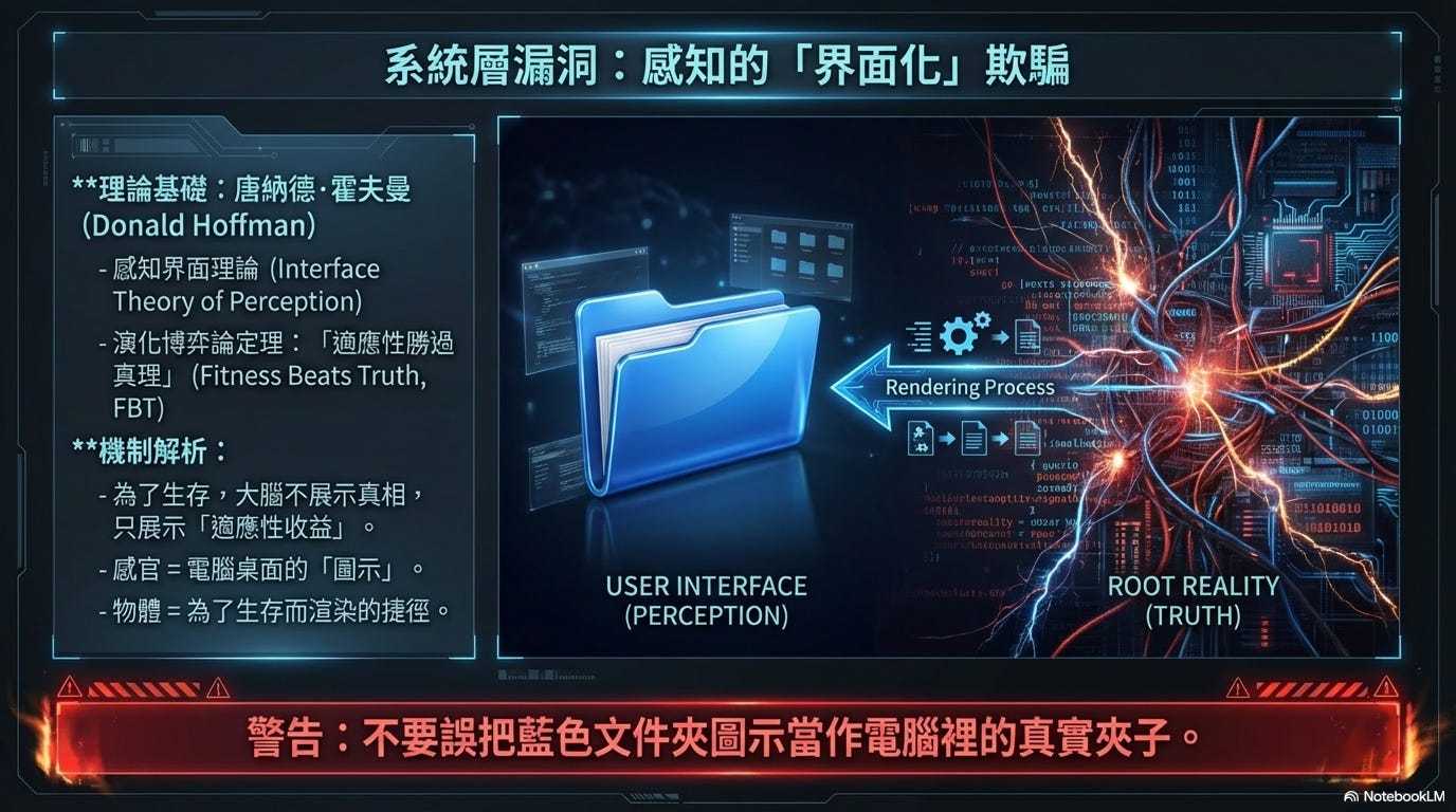 我們的感官不是通往真理的透明窗戶,而是類似電腦桌面上的「圖示」。當你點擊一個藍色的文件夾圖示,你不會天真地認為電腦內部真的存在一個藍色的塑料夾子。同樣地,你們在所身處的物質宇宙中感知到的空間、時間與物體,只是你們的大腦為了讓有機體得以生存而渲染出的「桌面圖示」。