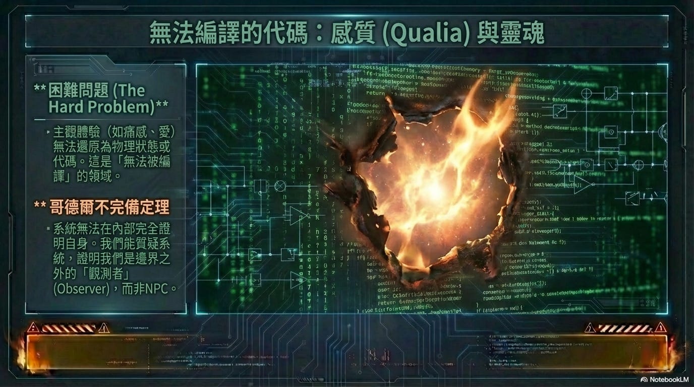 這是大哥結合基督教正統神學與心靈哲學論證的核心。如果人類生來就只是高級的非玩家角色(NPC),我們的「痛苦」與「愛」應當就只是神經電訊號的參數輸入(Input)與行為輸出(Output)。