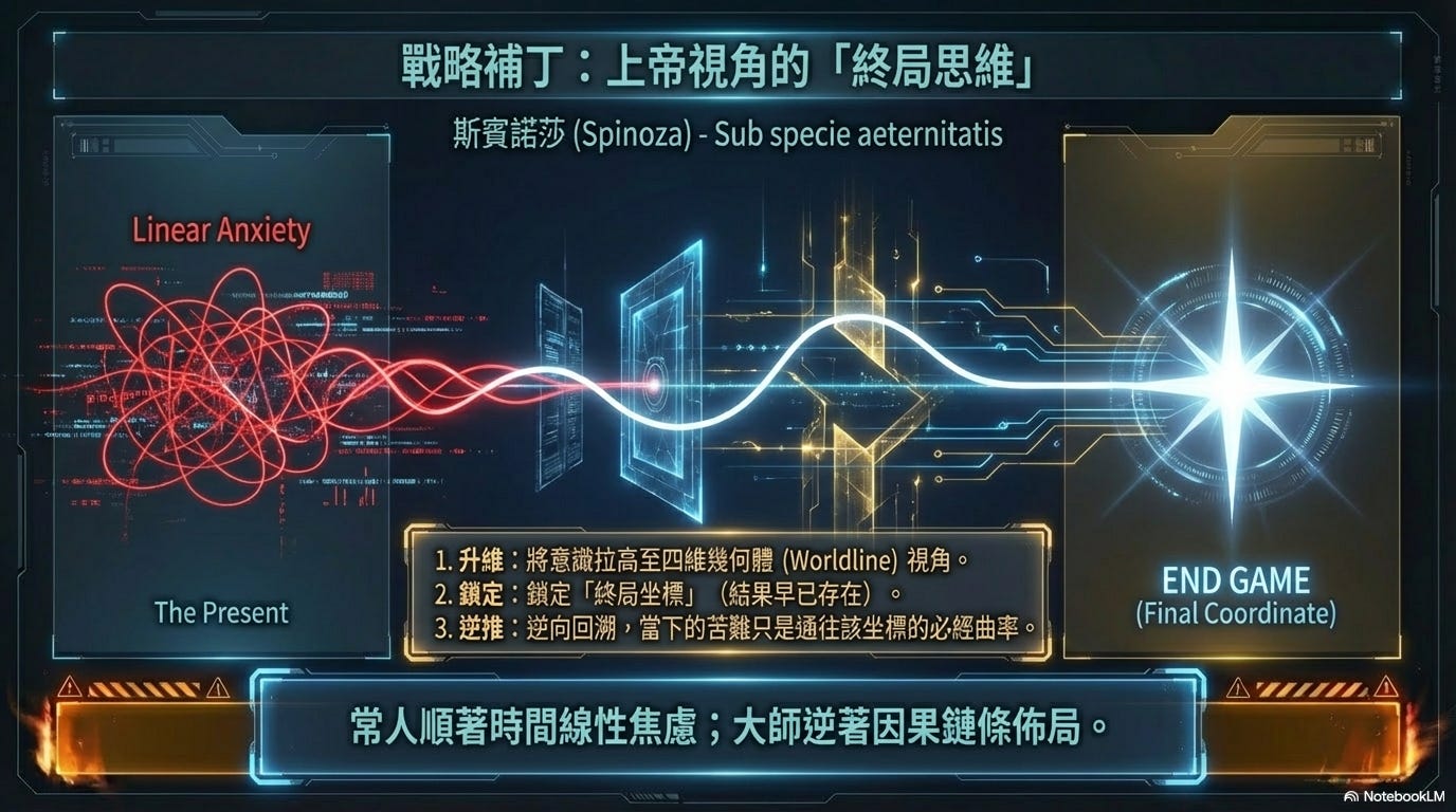 當遭遇人生的重大挫折甚至是親友的背叛或金融市場的全面崩盤時,不要讓自己被困在三維空間的切片中焦慮。試著將自身的意識拉高,將你們的人生視為一個在時空中已經完成的四維幾何體(Worldline)。在這樣的上帝視角下,未來的「結果」早已存在,當下的「困境」只是通往那個坐標點的必經曲率。