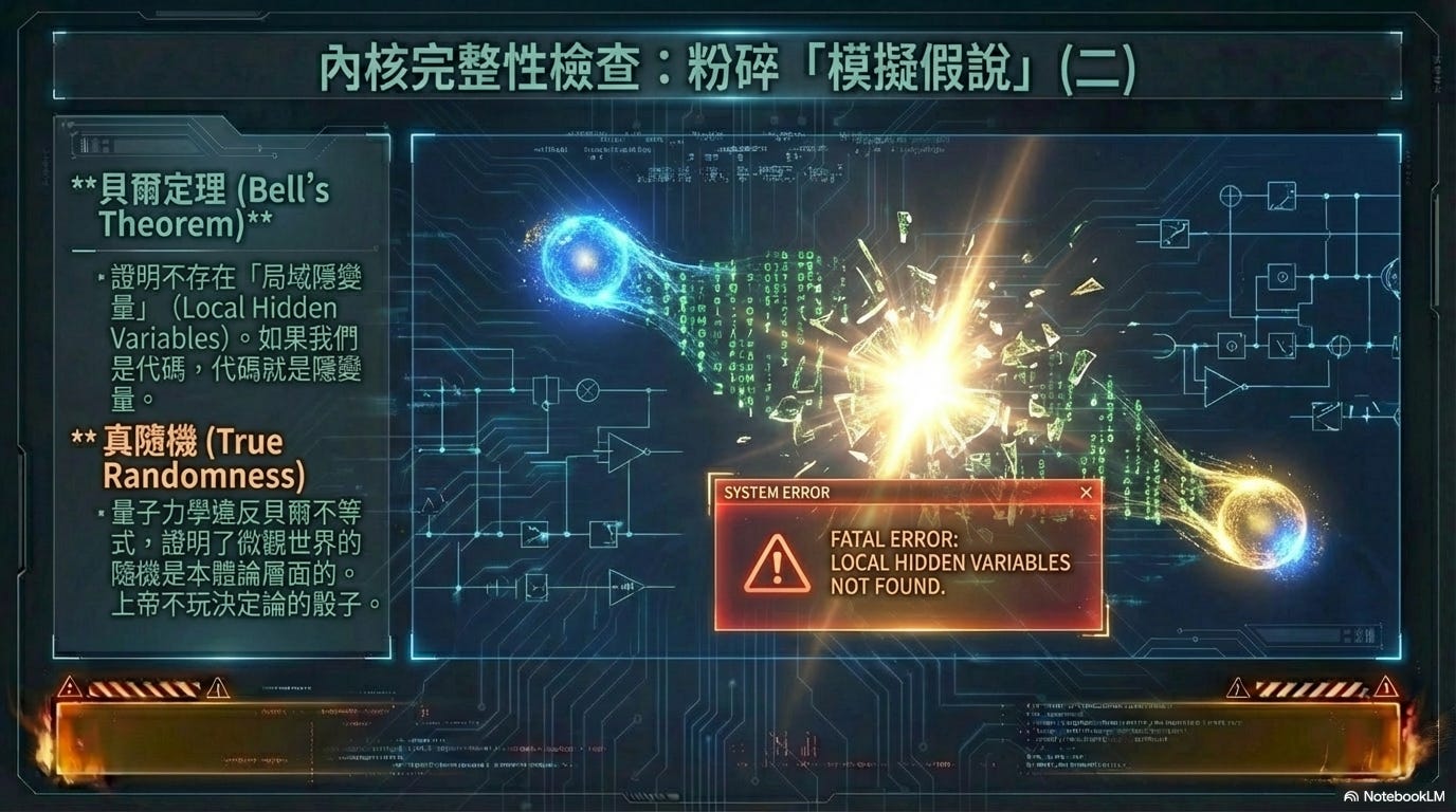 更致命的證據來自貝爾定理(Bell’s Theorem)的實驗驗證。這證明了量子糾纏之間不存在所謂的「局域隱變量」(Local Hidden Variables)。如果我們是程式碼,那麼程式碼就是那個「隱變量」,決定了我們的狀態。但量子力學證明了貝爾不等式被違反: