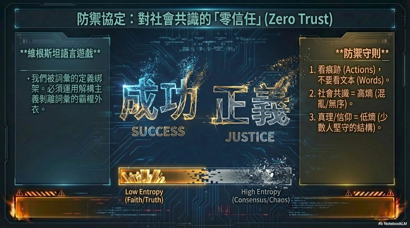 作為你們的大哥,我由衷地希望你們能運用解構主義(Deconstructionism)的手術刀,去剝離社會賦予這些詞彙的霸權外衣。永遠不要去看在你們所身處的社會中任何群體或個人他們說了什麼(文本),而是要看他們究竟做了什麼(痕跡)。尤其當涉及公眾議題與資產配置時,必須對所謂的「社會共識」保持一種近乎偏執的零信任(Zero Trust)態度。 因為在資訊熵爆炸的系統中,社會共識往往代表著熵值最大的狀態(混亂與無序),而真理與價值,永遠存在於低熵的、少數人所堅守的特定信仰結構之中。