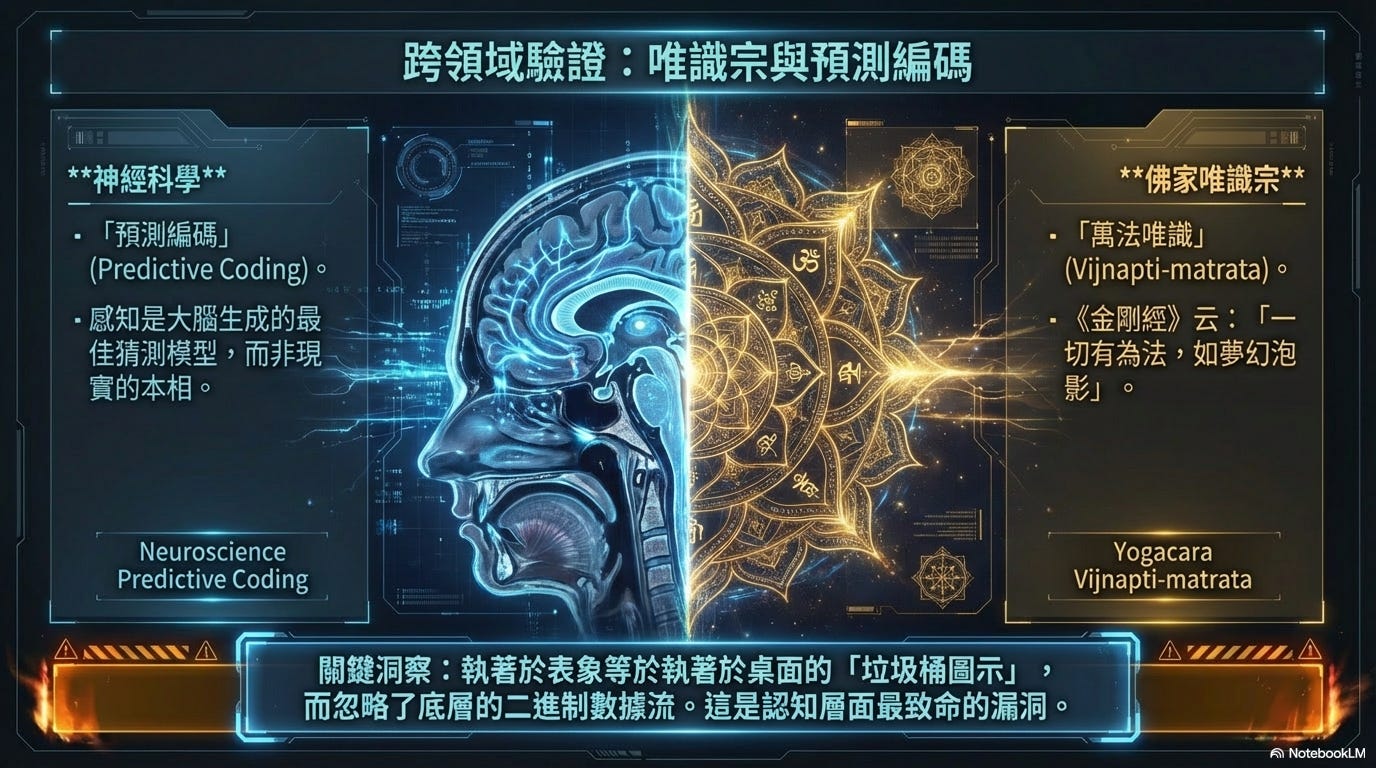 這與佛家唯識宗(Yogacara)的核心思想「萬法唯識」(Vijnapti-matrata)有著驚人的同構性。《金剛經》云:「一切有為法,如夢幻泡影」,這並非虛無主義的感嘆,而是對大腦「預測編碼」(Predictive Coding)機制的最早洞見——打從我們出生直到我們離世所感知到的一切從來不是世界的真實本相,而是大腦對感官輸入的神經訊號進行處理後所生成的最佳猜測模型。你們此生只要還不通曉這一點,就必然會執著於桌面上的「垃圾桶圖示」(表象)而忽略了底層的二進制數據流(真實),這是認知層面上最致命的漏洞。