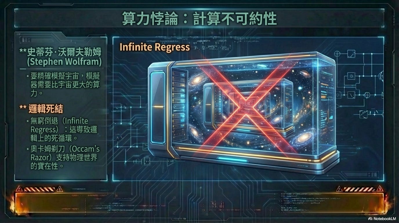 要想精確地模擬我們這個宇宙中每一個量子的波函數塌縮(Wave Function Collapse),模擬器本身所需的粒子數量與能量消耗將超過宇宙本身。亦即,要模擬一個宇宙,至少需要一個比這個宇宙更大的宇宙來承載其算力。 這在邏輯上便陷入了無窮倒退(Infinite Regress),違反了科學哲學中的奧卡姆剃刀原則(Occam’s Razor)——若無必要,勿增實體。與其假設一個無限層套娃的模擬器,承認物理世界的「實在性」是解釋成本最低、邏輯最自洽的結論。