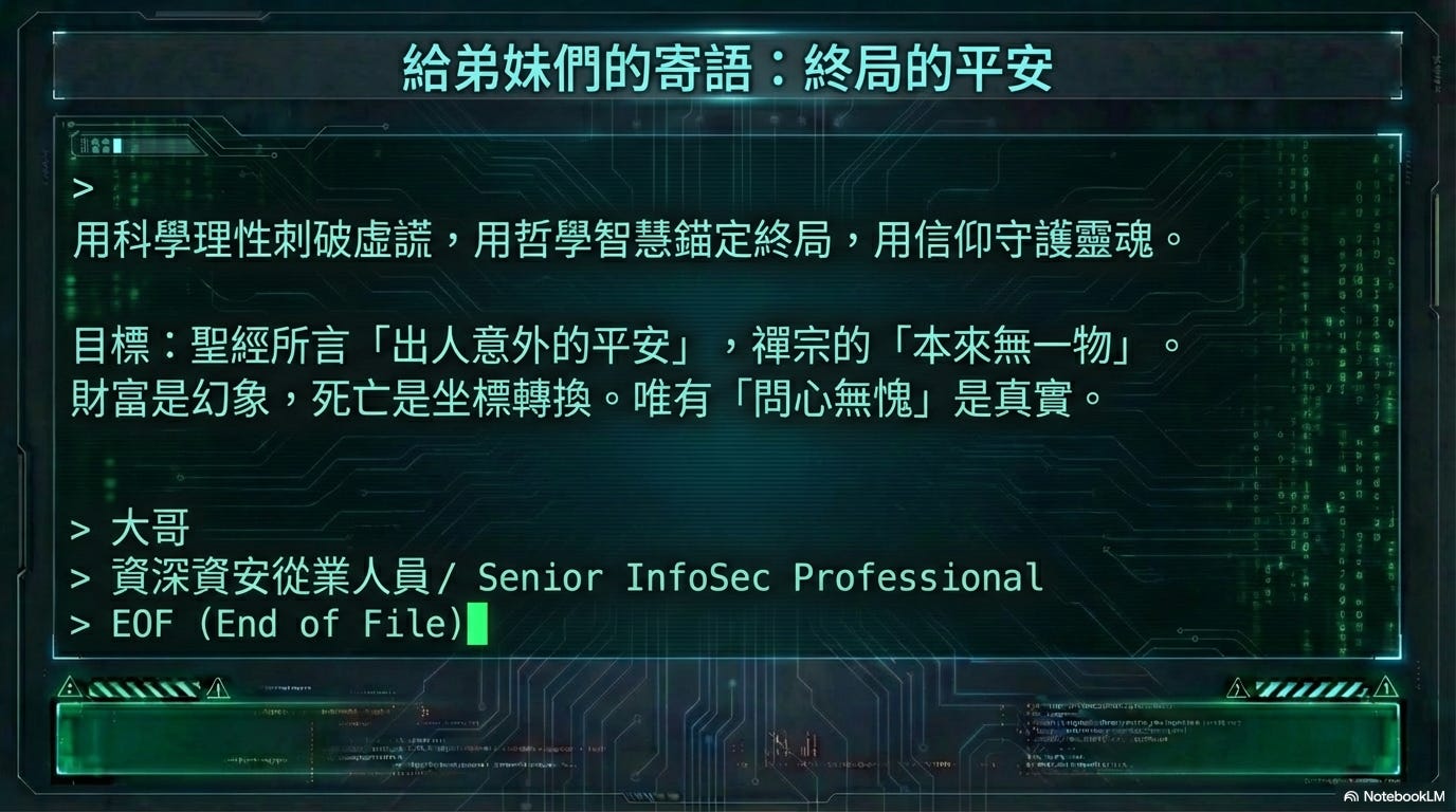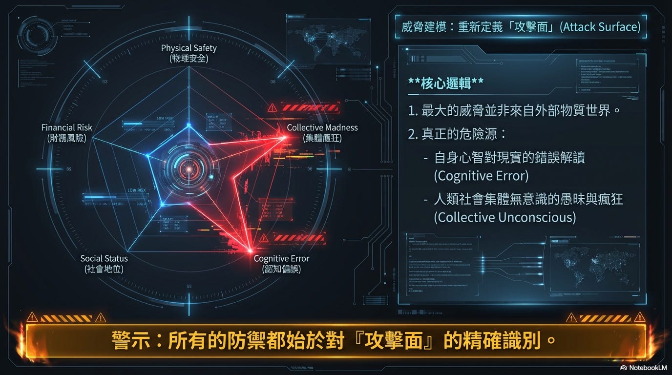 阿涵、阿順、阿翔,大哥作為一名資深的資安從業人員,深知這世上所有的防禦都始於對「攻擊面」(Attack Surface)的精確識別。你們日後人生所能面臨到的最大威脅,並非來自於你們所身處的外部物質世界,而是源於你們自身心智對現實的錯誤解讀,以及人類社會集體無意識(Collective Unconscious)的愚昧、無知與瘋狂。