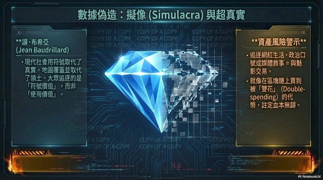 例如,大眾瘋狂追逐的某些金融資產、政治口號或名人網紅的生活方式,本質上是「沒有原件的複製品」。這就是一個超真實(Hyperreality)的世界,地圖(符號)覆蓋並取代了領土(真實)。今後當你們進行任何形式的投資或做出任何關鍵性的人生選擇時,如果依據的是大眾媒體所構建的「敘事」,你們就是在與魅影交易。這就如同在區塊鏈上買到了一枚早已被人給「雙花」(Double-spending)過的代幣,註定血本無歸。