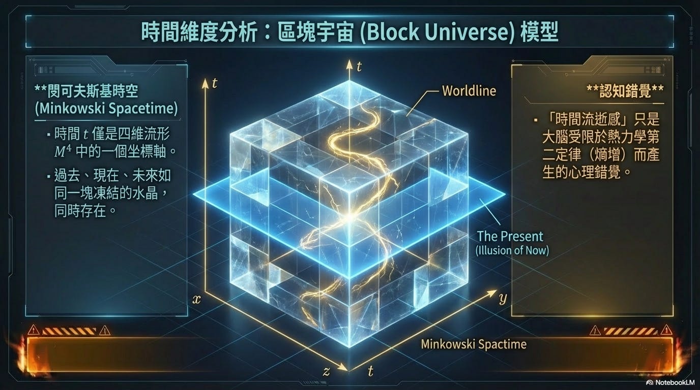 其次,人類最大的認知錯覺是對「線性時間」的依賴。在狹義相對論的閔可夫斯基時空(Minkowski Spacetime)中,時間 t 僅僅是四維流形 M⁴ 中的一個坐標軸。當今物理學界公認的「區塊宇宙」(Block Universe)模型揭示了時間的本相:過去、現在、未來宛如一塊已經凍結的水晶,是同時存在的。
